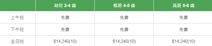 學校有參加「幼兒園教育計劃」,以下列出扣減政府資助后不同班別的全年學費和期數。